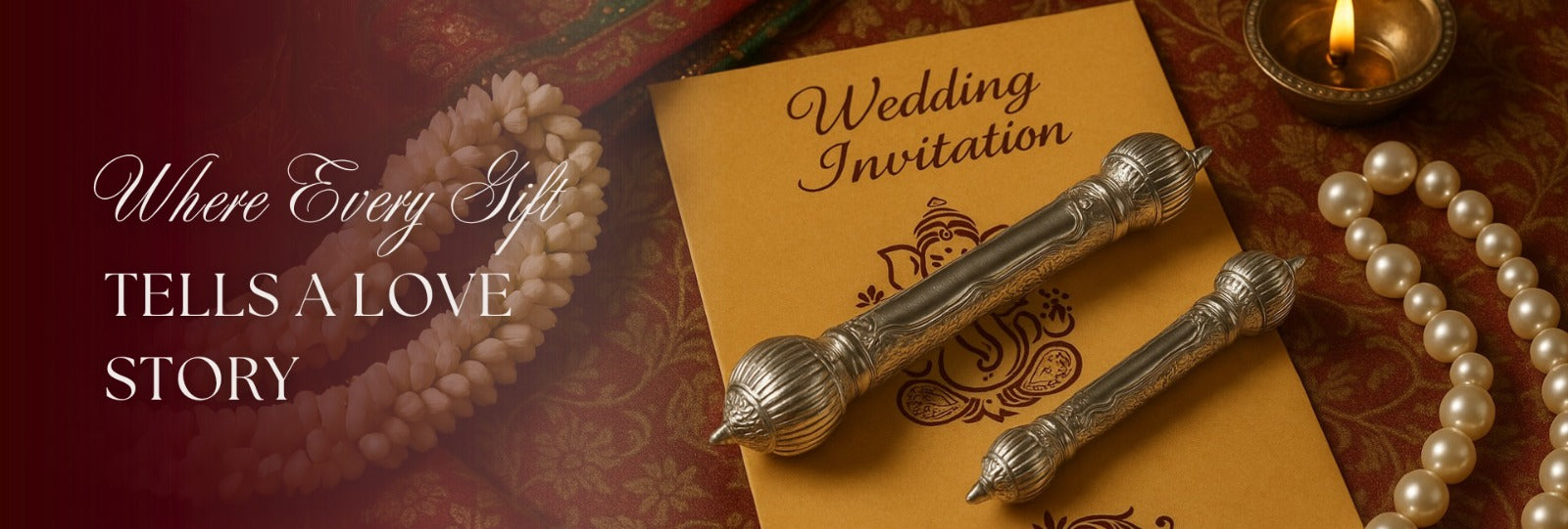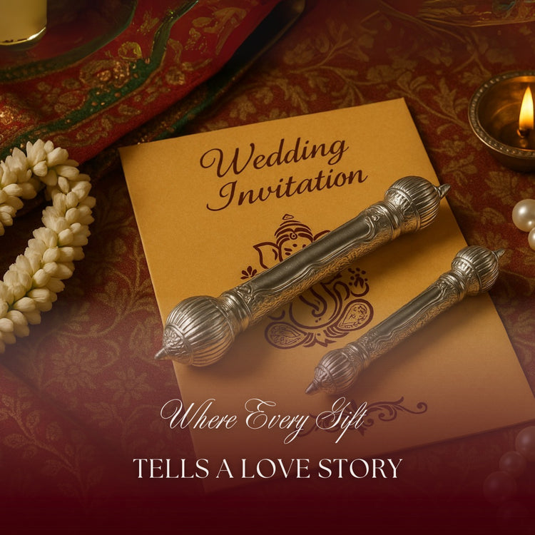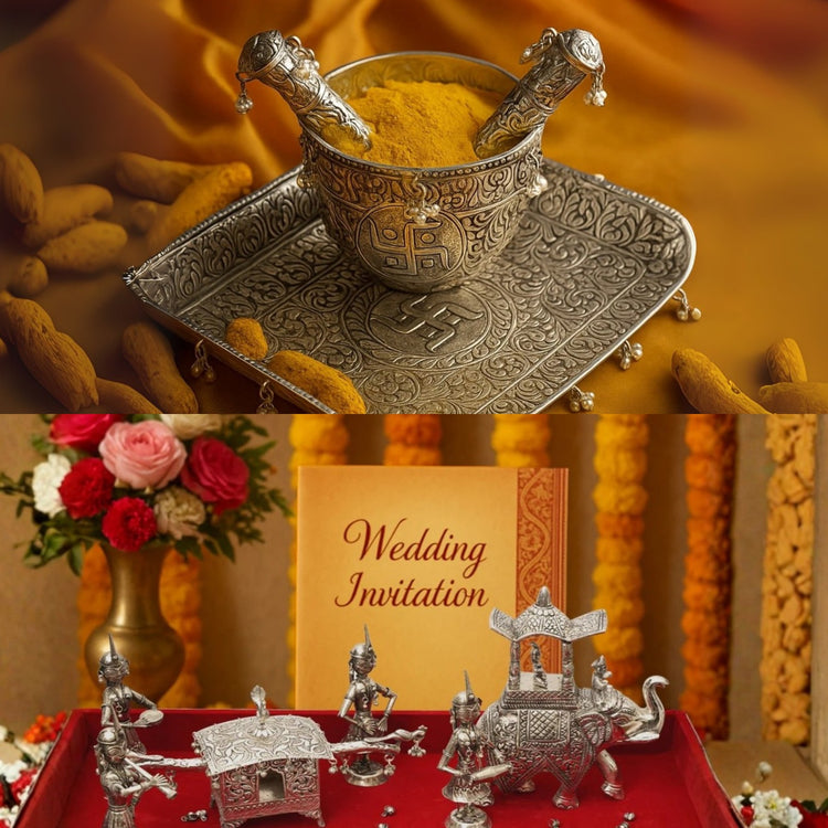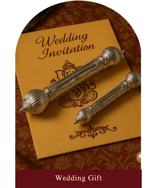 Make your wedding announcement unforgettable with this regal German Silver First Invite Wedding Card Set, thoughtfully curated to reflect elegance, tradition, and grandeur. This exquisite set includes a beautifully crafted horse chariot symbolizing royalty and prosperity, a fine carved photo frame for inserting the...