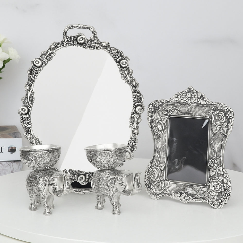 The German Silver 3-Piece Décor Set is a luxurious and thoughtfully curated ensemble that combines utility with aesthetic elegance. Featuring a beautifully crafted photo frame, an intricately designed elephant-shaped bowl, and an elegant serving or display tray, this set showcases the fine artistry of traditional Indian metalwork. Made from premium German silver, each piece boasts rich detailing, a polished silver finish, and timeless appeal — making it perfect for home décor, pooja setups, or as a high-end gifting option for weddings, anniversaries, or festive occasions.
