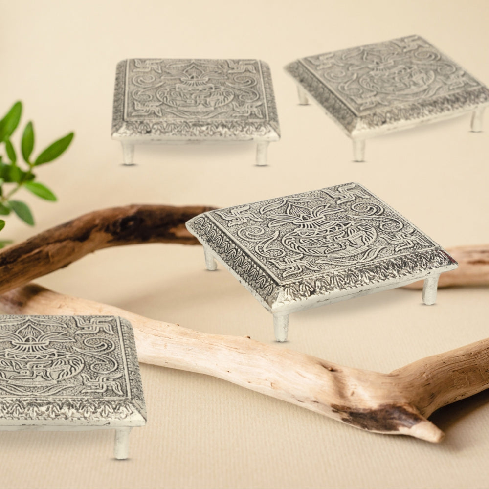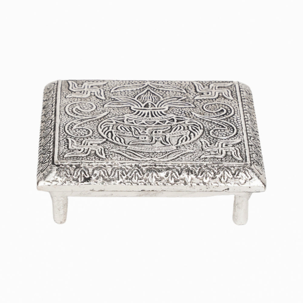 Add a sacred and elegant touch to your space with this beautifully crafted German Silver Chowki Miniature. Traditionally used in Indian households during poojas and rituals, this miniature chowki is a compact platform adorned with intricate embossing and an antique silver finish. Crafted from high-quality German silver, it showcases fine detailing and traditional motifs, making it both a functional and decorative item.