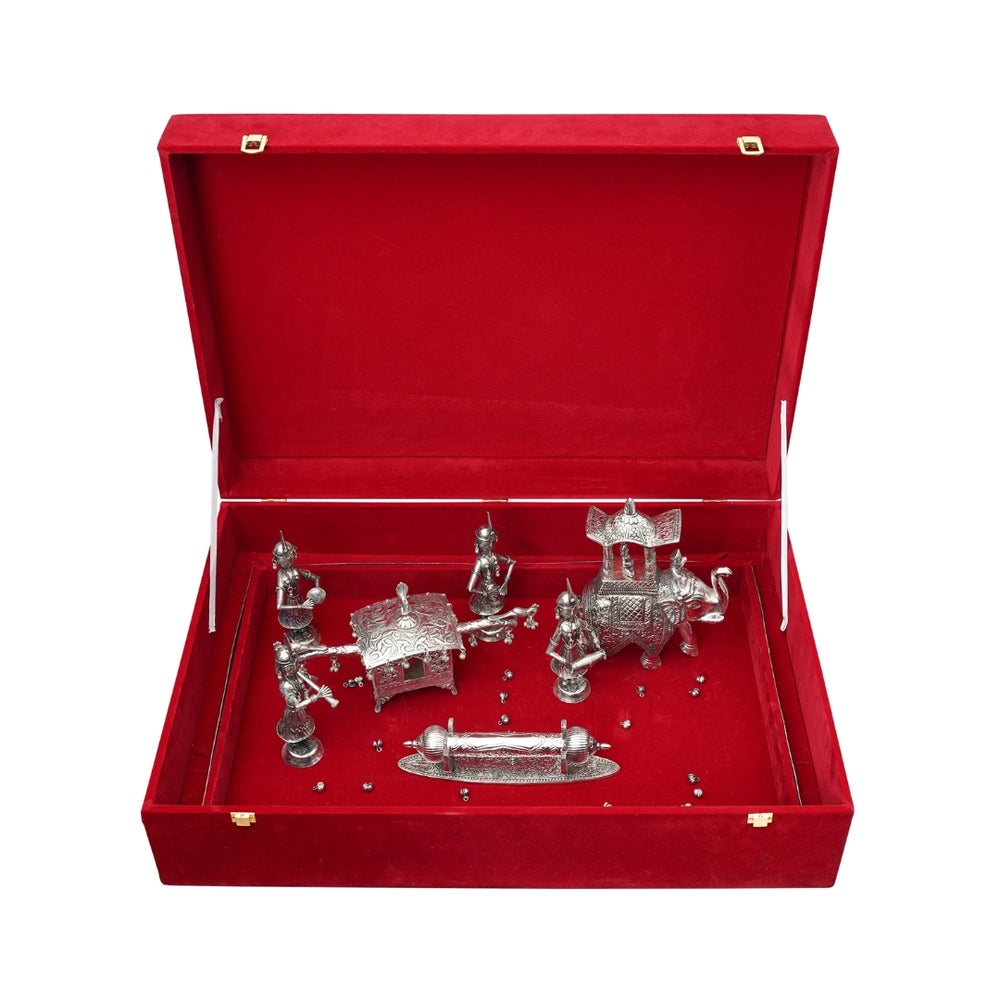Crafted from premium German silver, the piece includes miniature figures: a royal elephant with a howdah (ambabari) symbolizing royalty and arrival, a bride in a doli, four decorative dolls representing the wedding entourage, a lagan patrika (wedding invitation scroll), and floral elements that complete the ceremonial setting. More than an invitation, it serves as a timeless memento of blessings, tradition, and celebration.
