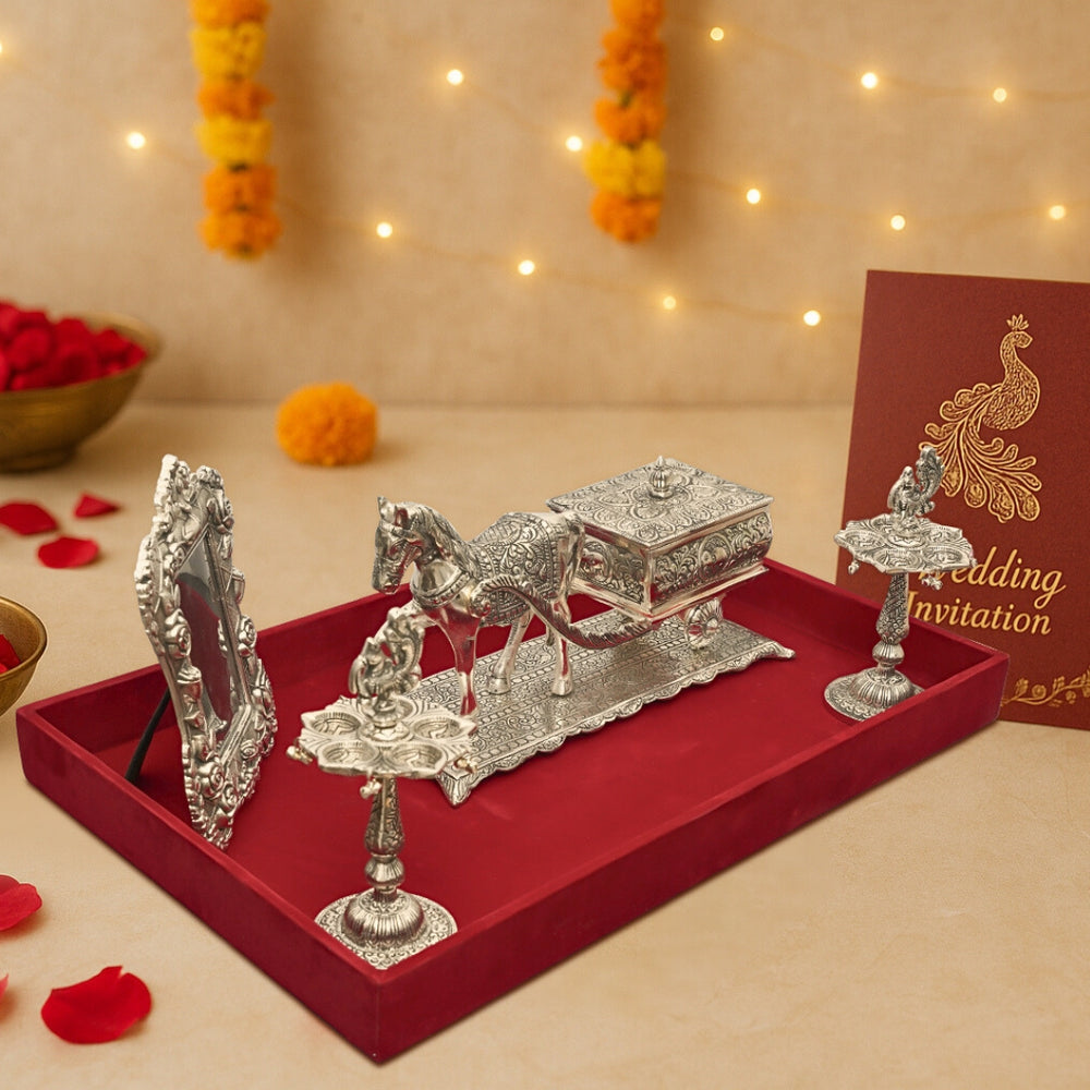 Make your wedding announcement unforgettable with this regal German Silver First Invite Wedding Card Set, thoughtfully curated to reflect elegance, tradition, and grandeur. This exquisite set includes a beautifully crafted horse chariot symbolizing royalty and prosperity, a fine carved photo frame for inserting the invitation or a photo, and two traditional diyas, all set on a rich velvet tray and enclosed in a luxurious velvet box.