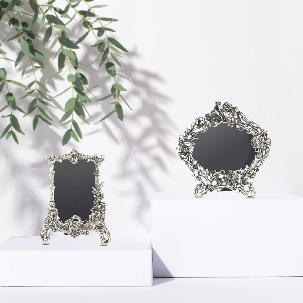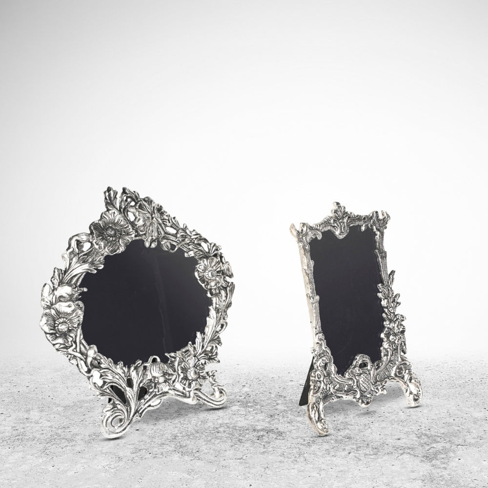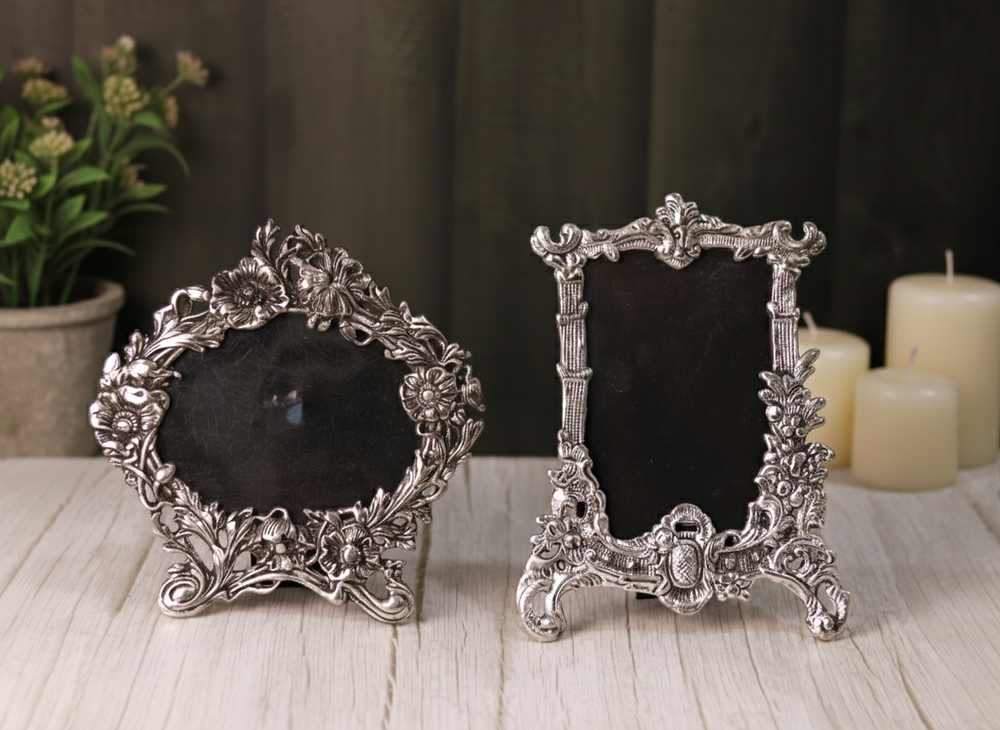 Showcase your most treasured memories in regal style with our German Silver Oval Photo Frame, delicately embellished with sparkling stone accents. This exquisite frame features a graceful oval shape, set in a finely detailed German silver border that radiates antique charm and luxury. The embedded stones carving add a subtle shimmer, enhancing the overall elegance and making your photograph the centerpiece it deserves to be.