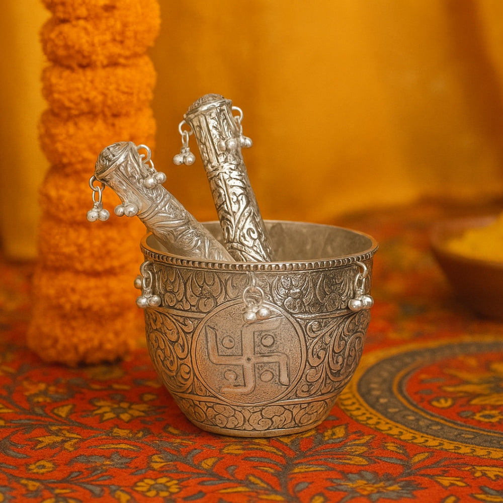 Includes a compact Okhal (bowl-shaped mortar) and Musli (pestle) with beautifully detailed engravings or embossed patterns.
