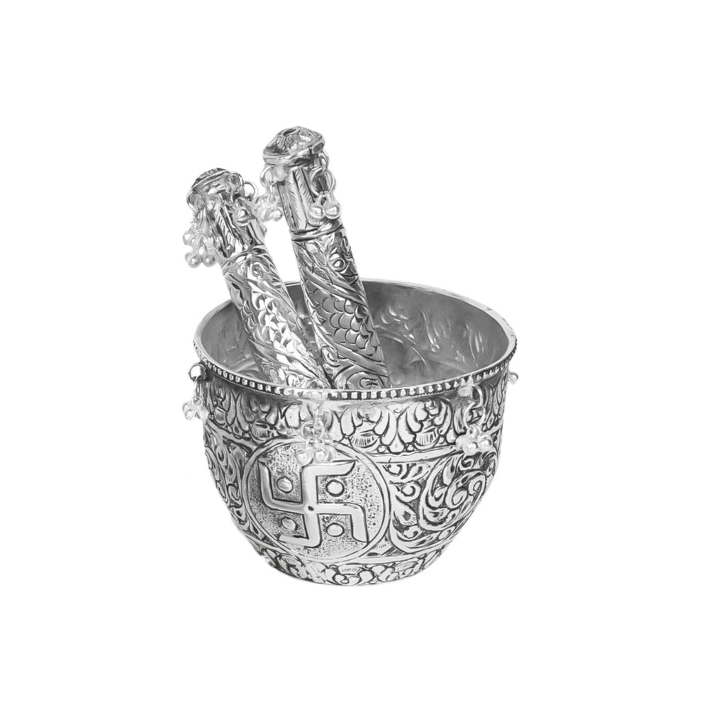 The German Silver Okhal and Musli is a beautifully handcrafted traditional set that holds deep cultural significance, especially in Indian wedding rituals like the Haldi ceremony. Made from high-quality German silver, the Okhal (mortar) and Musli (pestle) set is symbolic of purity, prosperity, and auspicious beginnings. It is primarily used for preparing and presenting the turmeric (haldi) paste during pre-wedding ceremonies. Adorned with intricate engravings and a lustrous silver finish, this set is both functional and decorative—perfect for enhancing the spiritual and cultural charm of wedding functions.