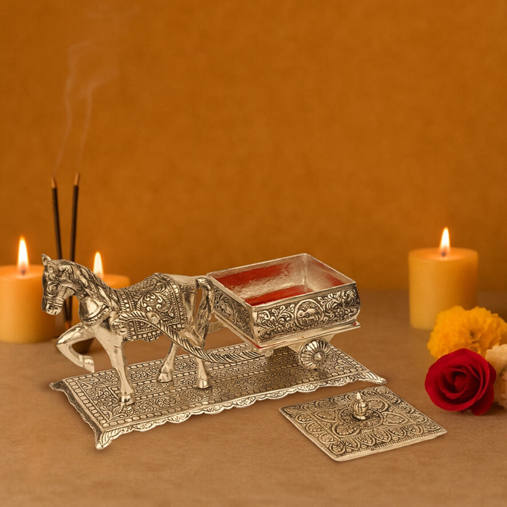 The German Silver First Invite Wedding Card featuring a Horse Chariot, Doli, and Four Dolls is a beautifully crafted ceremonial piece that holds deep cultural significance. Traditionally used in Indian weddings as the “Shubh Shagun” first wedding invitation, this card is a symbol of prosperity, grace, and the joyful journey of marriage. Intricately handcrafted from premium German silver, it artistically depicts key elements of a royal Indian wedding procession — the bride in a doli (palanquin), the groom in a horse chariot, and four dolls representing family members or attendants.