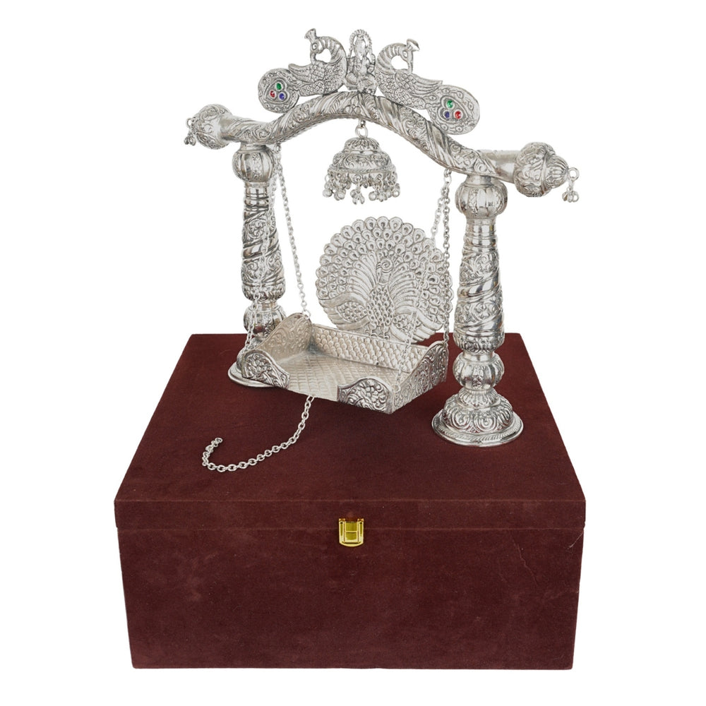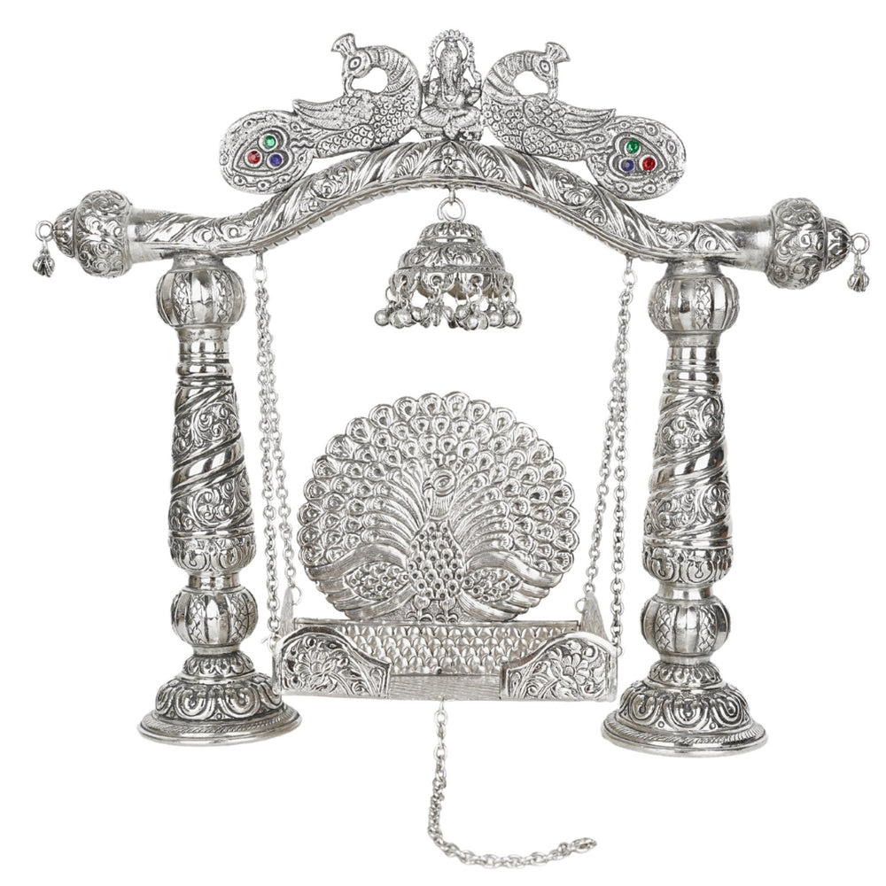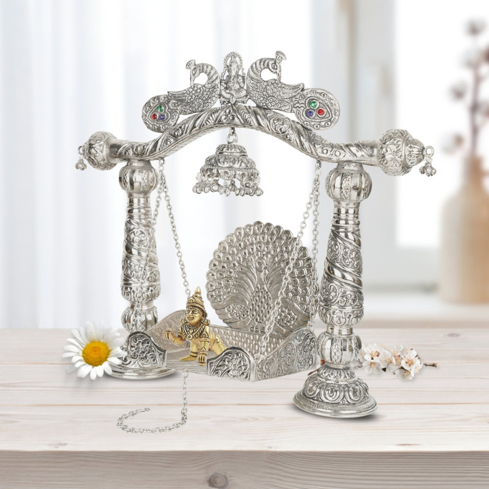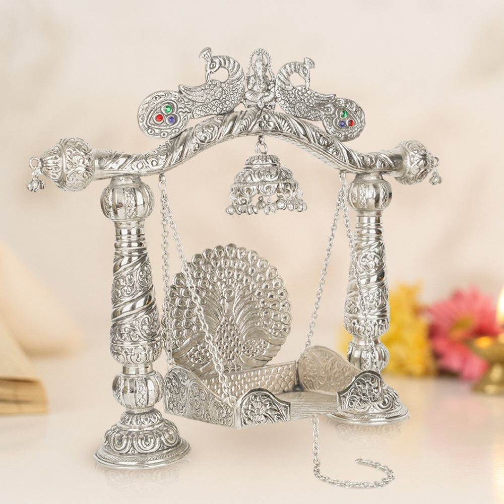 Made from premium German silver, the swing is adorned with ornate carvings and a gleaming finish that enhances its divine aura. Whether for daily worship or festive décor, this jhoola becomes a captivating centerpiece in any spiritual setting.