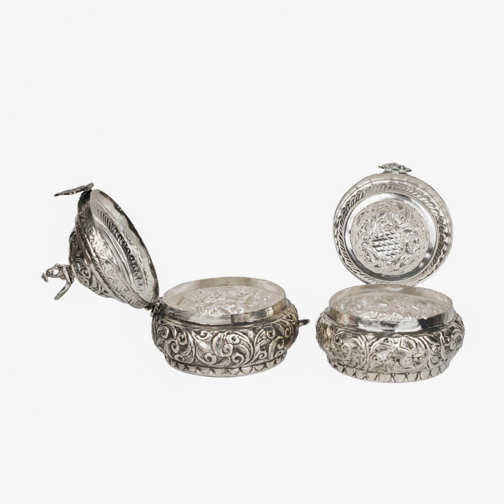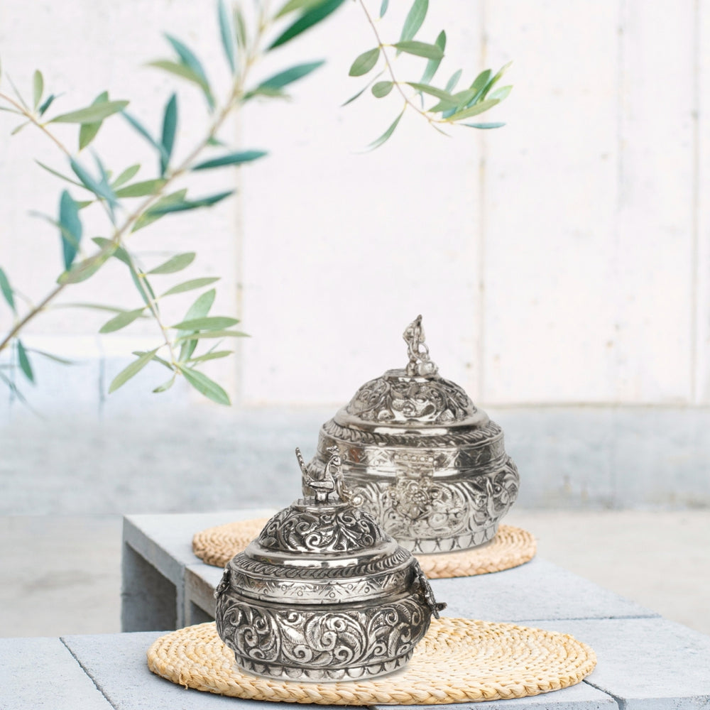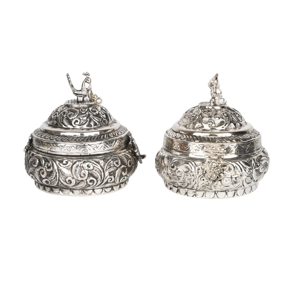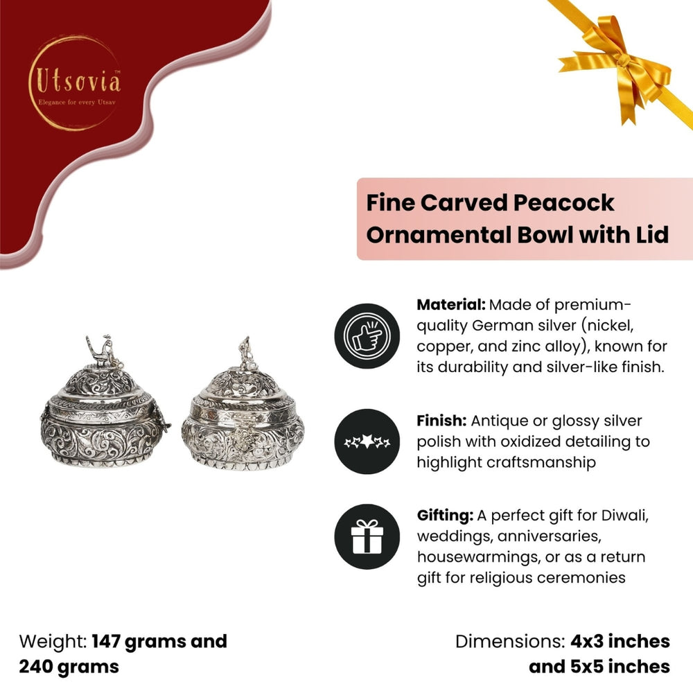 Celebrate timeless artistry with this stunning German Silver Fine Carved Peacock Ornamental Bowl with Lid. This intricately designed bowl features a beautifully engraved body with a majestic peacock motif—a symbol of grace, beauty, and prosperity. Topped with a matching lid and often crowned with a miniature peacock or traditional finial, this bowl exemplifies Indian heritage and craftsmanship.
