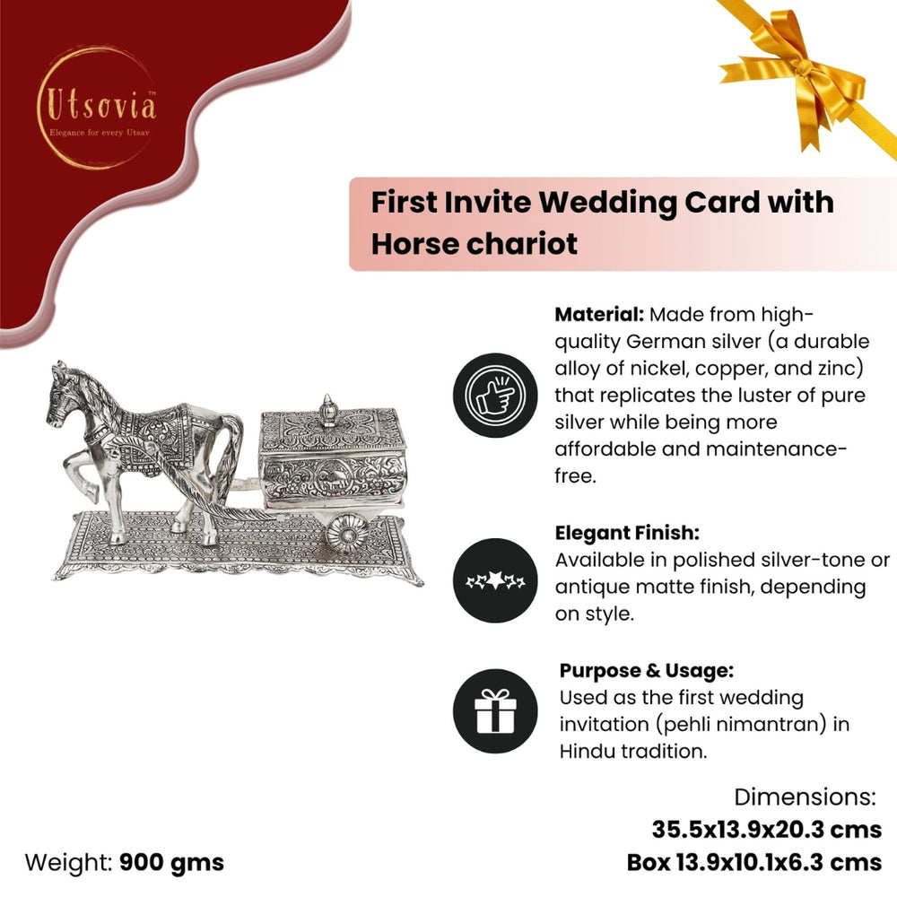 The German Silver First Invite Wedding Card featuring a Horse Chariot, Doli, and Four Dolls is a beautifully crafted ceremonial piece that holds deep cultural significance. Traditionally used in Indian weddings as the “Shubh Shagun” first wedding invitation, this card is a symbol of prosperity, grace, and the joyful journey of marriage. Intricately handcrafted from premium German silver, it artistically depicts key elements of a royal Indian wedding procession — the bride in a doli (palanquin), the groom in a horse chariot, and four dolls representing family members or attendants.