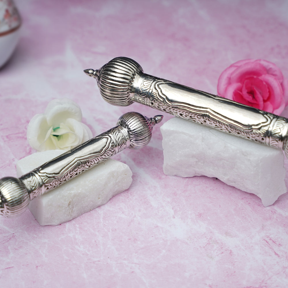 Preserve your heartfelt messages, sacred mantras, or ceremonial scrolls in our exquisitely designed German Silver Scroll Holder. Inspired by royal traditions and spiritual customs, this elegant piece is meticulously handcrafted with intricate patterns and a polished finish that adds a regal charm to any occasion.