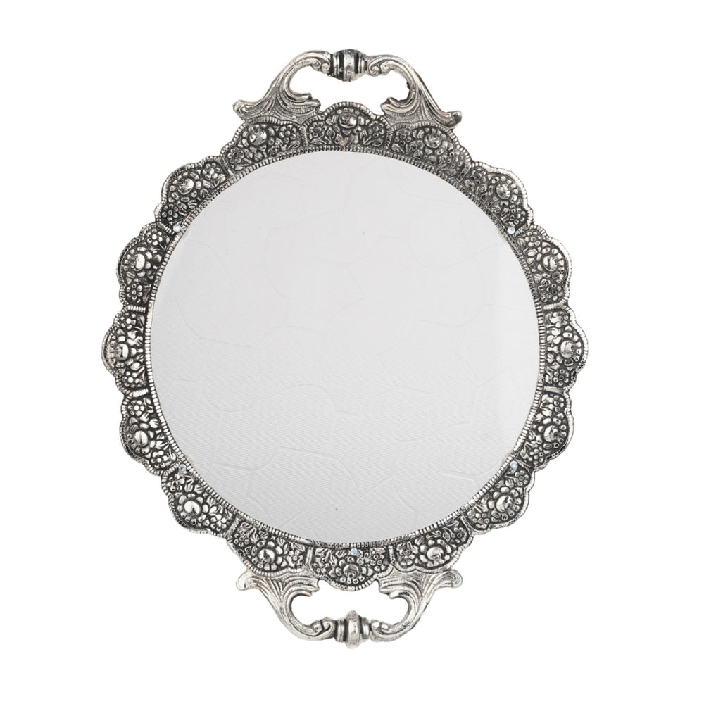 Add a touch of luxury and tradition to your serveware collection with our German Silver Metal and Fibre Oval Tray. Beautifully designed with a combination of premium-quality German silver metal and durable fibre base, this tray blends ornate elegance with everyday functionality. The oval shape and intricately carved borders lend it a regal charm, perfect for serving sweets, dry fruits, or as a decorative pooja platter.