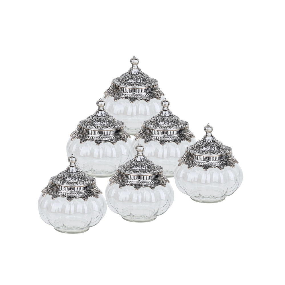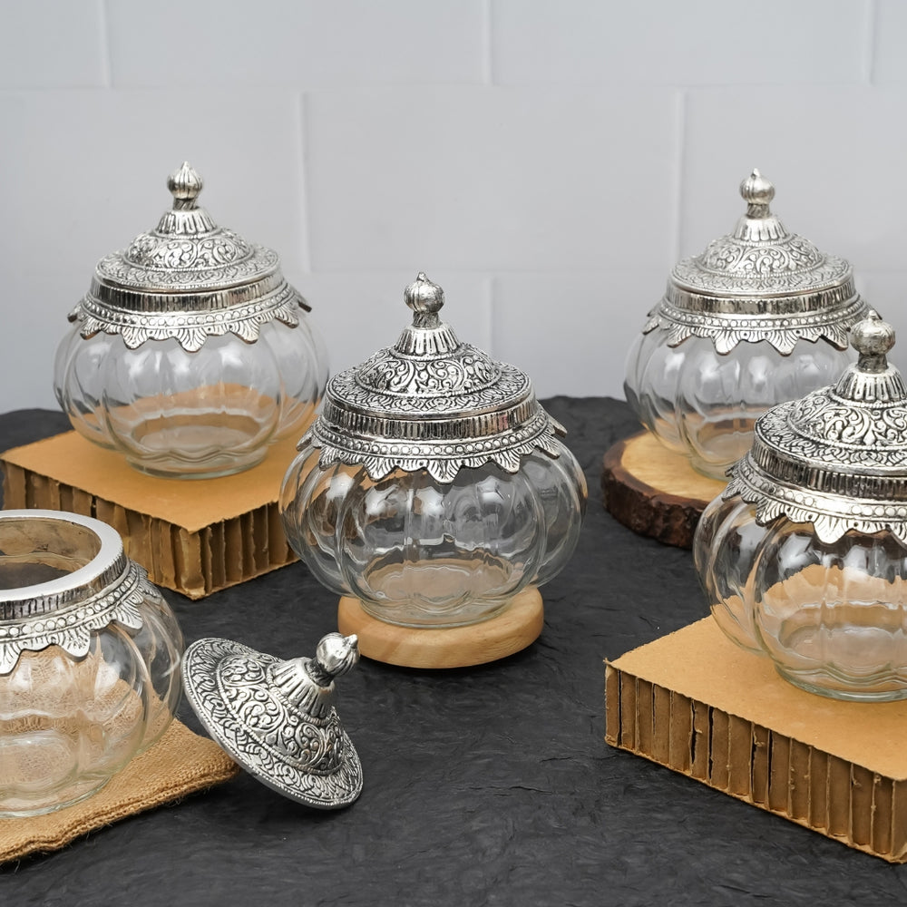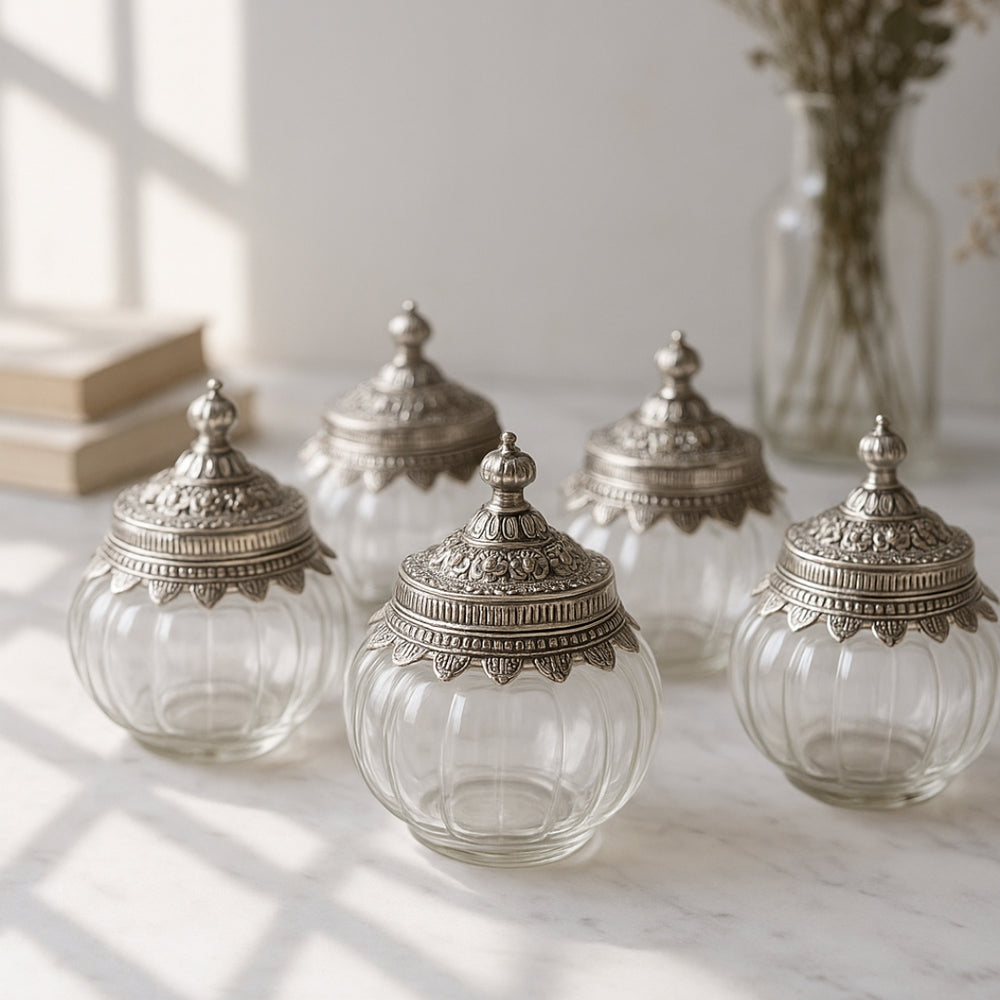The German Silver Pumpkin-Shaped Jar is an elegant and uniquely designed storage container that blends traditional craftsmanship with functional beauty. Crafted from premium German silver, this jar features a rounded, ribbed design resembling a pumpkin, symbolizing prosperity and abundance in many Indian cultures. Often used to store kumkum, haldi, mishri, dry fruits, or pooja items, it doubles as a decorative piece on pooja thalis, coffee tables, or festive platters. Its intricate detailing and silver-toned finish make it an eye-catching addition to any spiritual or cultural setting.