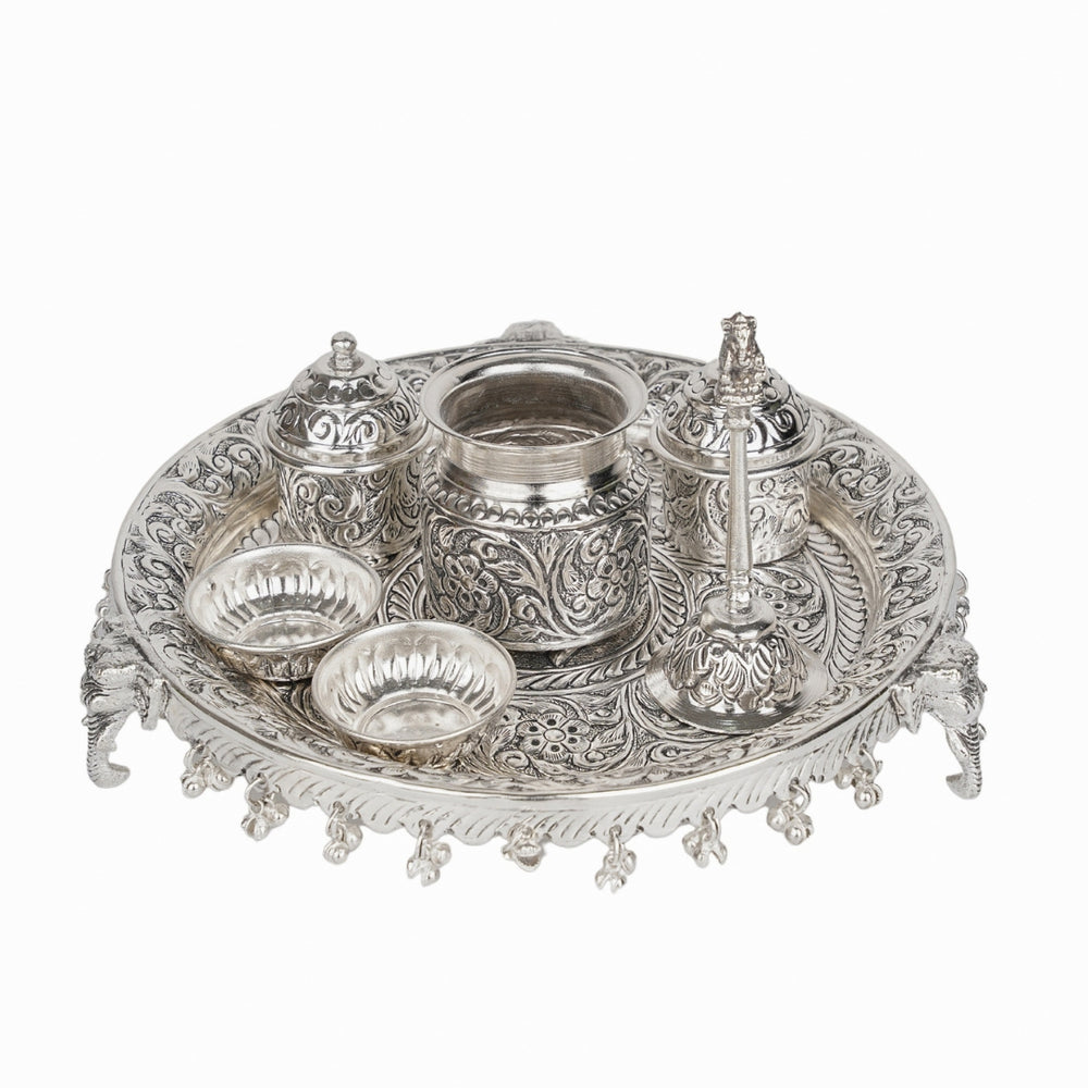 Bring divine grace and cultural richness to your rituals with this stunning German Silver Pooja Thali Set, intricately designed for traditional worship. The centerpiece of the set is a finely carved thali resting on four elegant elephant-shaped legs, symbolizing strength and auspiciousness. Adorned with tiny ghungroos around the border for a festive look, this thali includes a miniature Kalash, two kumkum/roli chawal containers, and a matching bell — all handcrafted from premium German silver.