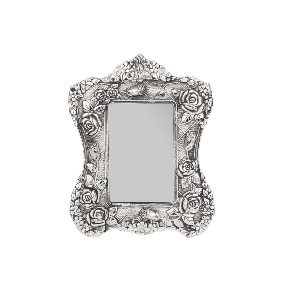 Design: Rectangular shape with a detailed, ornamental silver border and a rose-colored interior backing or mat.