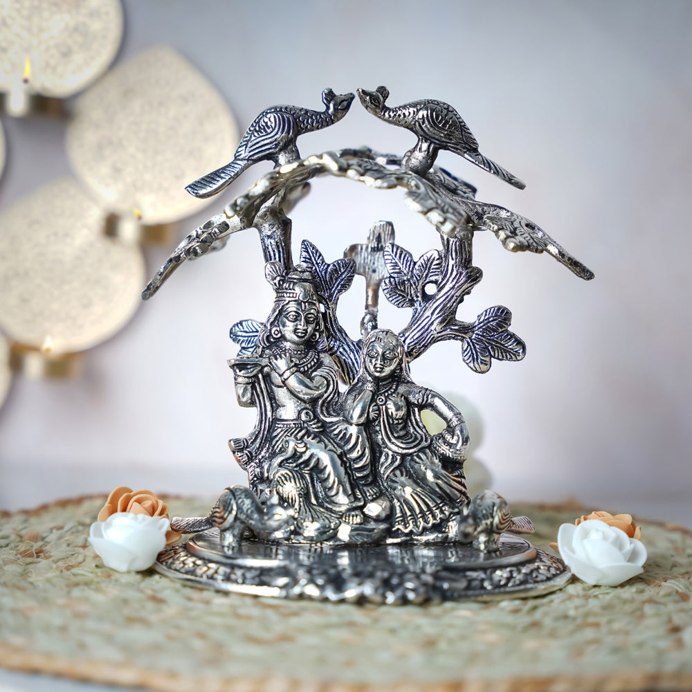 Invite serenity and spiritual grace into your space with our German Silver Radha Krishna Cow Tree sculpture—a breathtaking representation of divine love, harmony, and nature. This intricately handcrafted piece features Lord Krishna with Radha, accompanied by a sacred cow under a beautifully detailed tree, all rendered in radiant German silver.