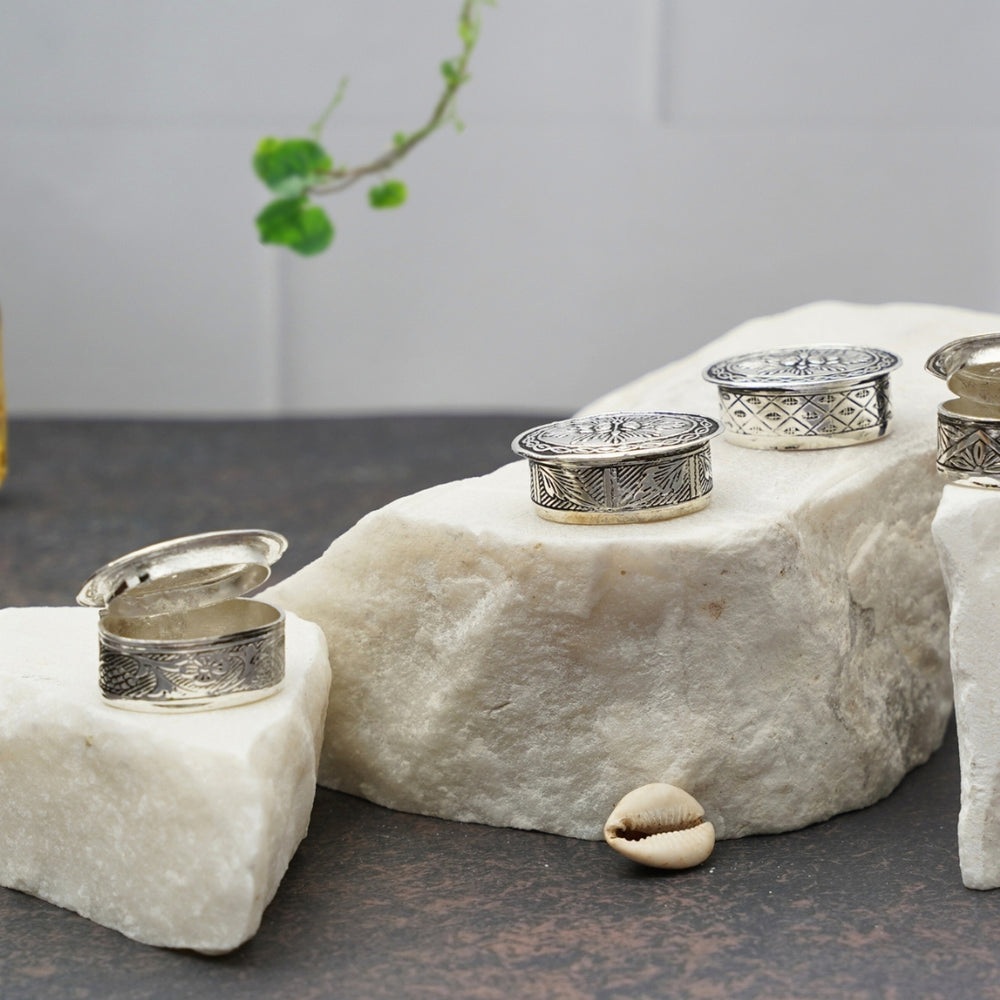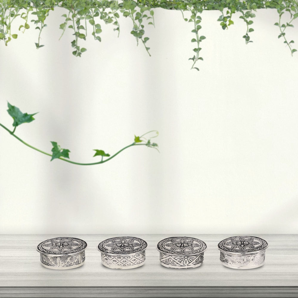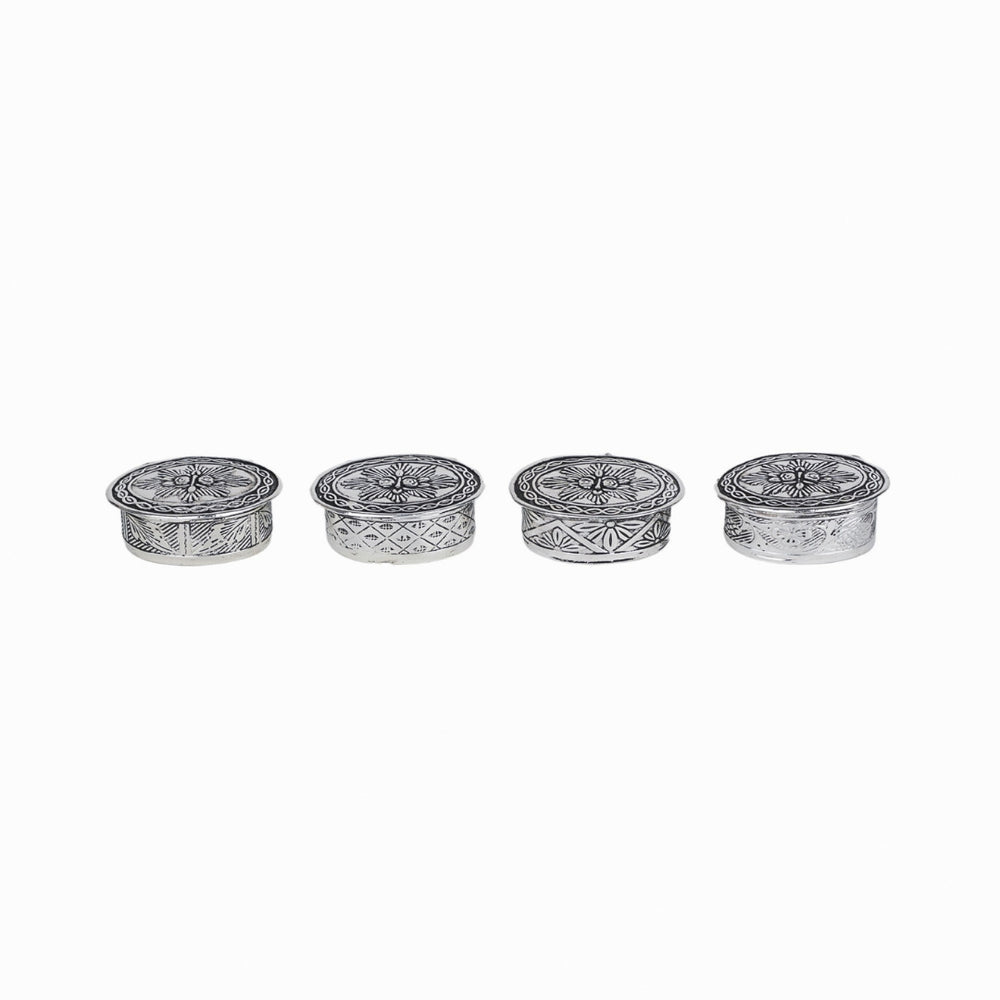Elevate your pooja rituals with this beautifully crafted German Silver Sindoor/Roli Chawal Dibbi. Designed to hold sacred powders like sindoor (vermilion), roli, and chawal (rice), this dibbi (box) is an indispensable accessory for Hindu worship and ceremonies. Made from premium German silver, it features intricate hand-engraved motifs that showcase traditional Indian artistry, combining utility with elegance.