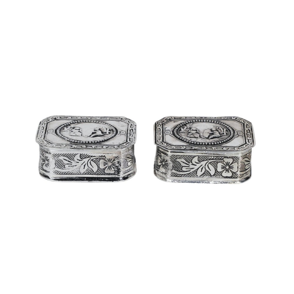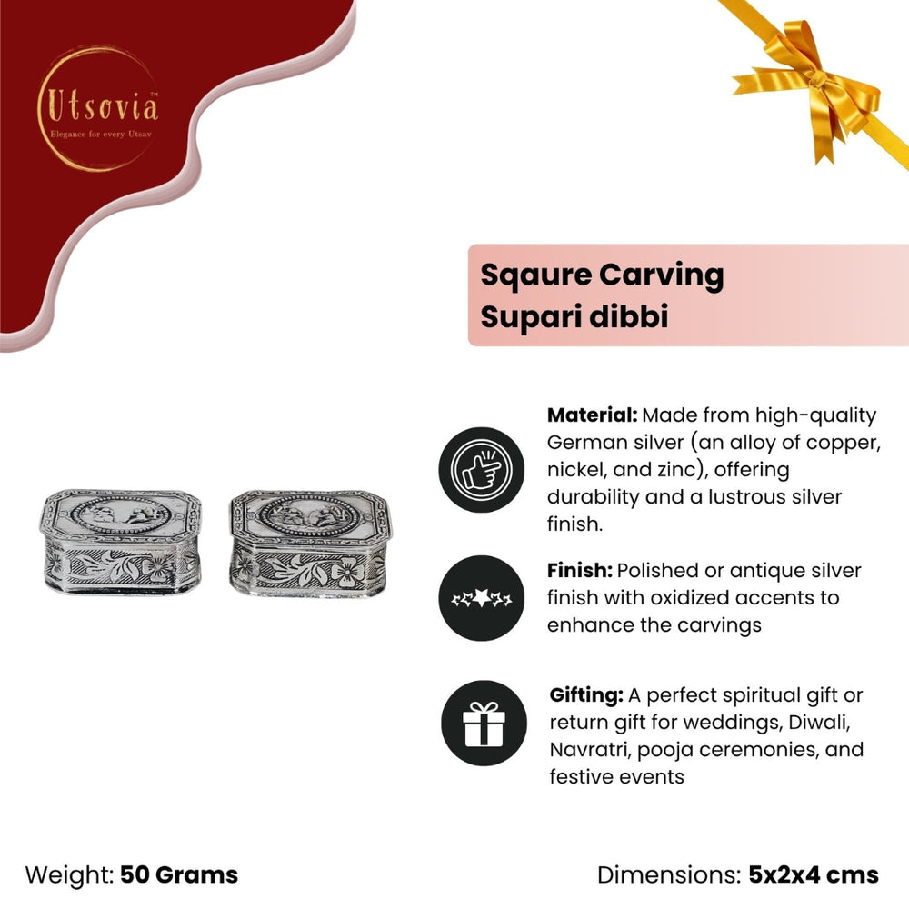 Enhance your pooja rituals or living space with this beautifully crafted German Silver Square Carving Supari Dibbi. Traditionally used to store supari (betel nuts), this dibbi combines cultural significance with intricate craftsmanship. Made from premium German silver, the box features detailed square-shaped carvings inspired by classic Indian motifs, reflecting timeless artistry.