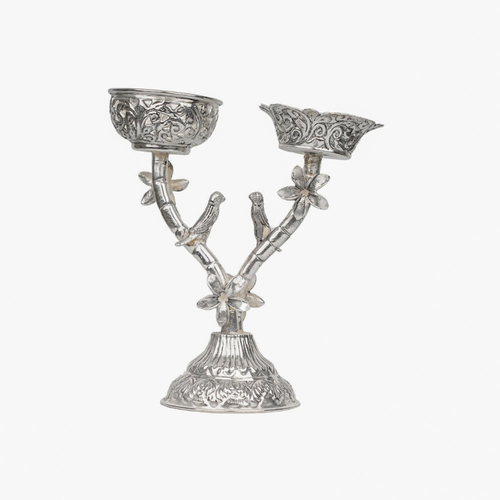 Bring timeless elegance and charm into your home with this exquisite German Silver Twin Arm Candle Holder. Designed with a vintage-inspired silhouette and crafted from fine-quality German silver, this piece features two gracefully curved arms extending from a central base, each holding a candle for perfect balance and symmetry. Intricately carved with traditional motifs, the candle holder adds a touch of sophistication to any space—whether it’s a dining table, mantle, or pooja room.